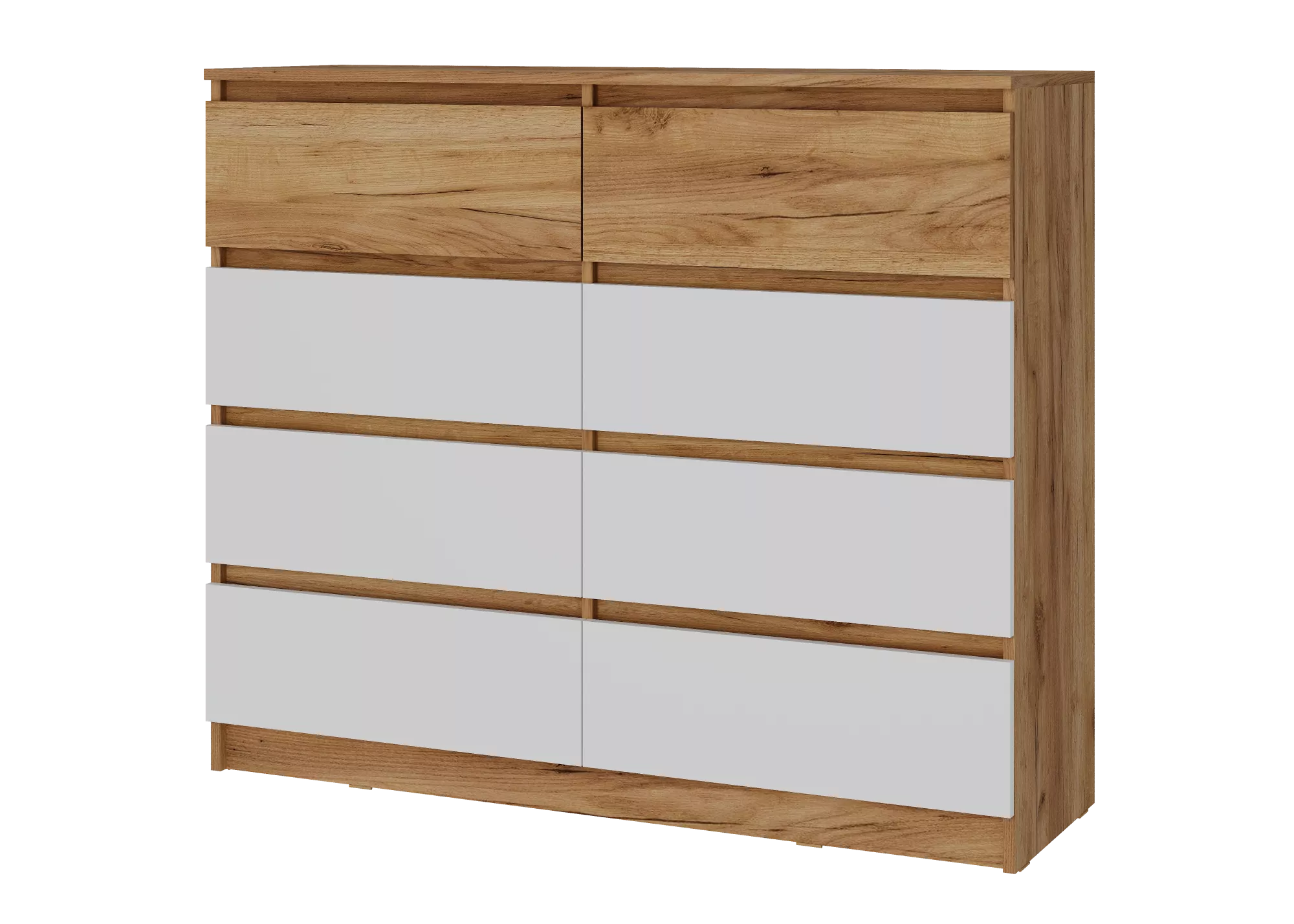 Без ручек, для открывания ящиков предусмотрены зазоры 30 мм, которые закрываются планкой в цвет корпуса.