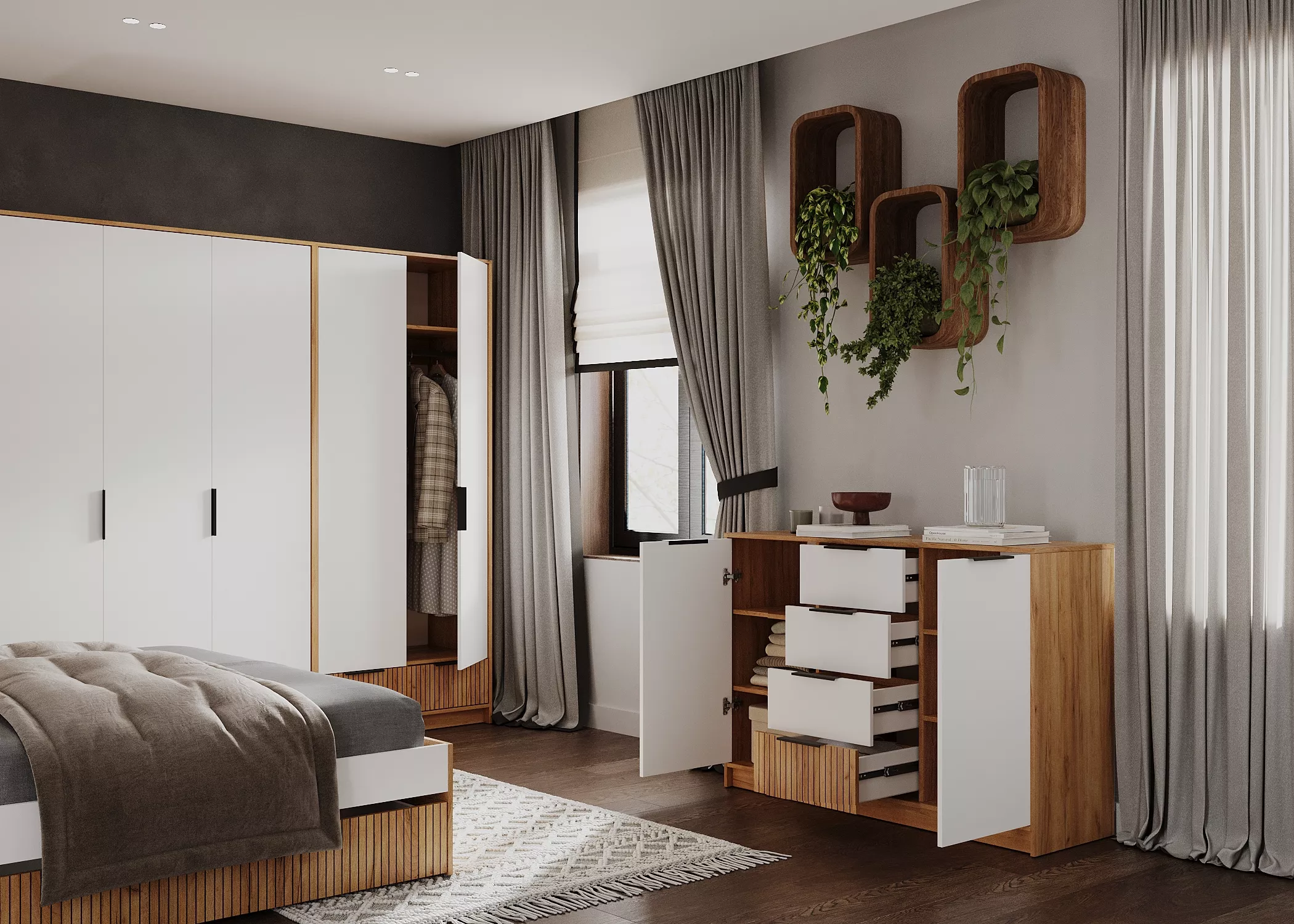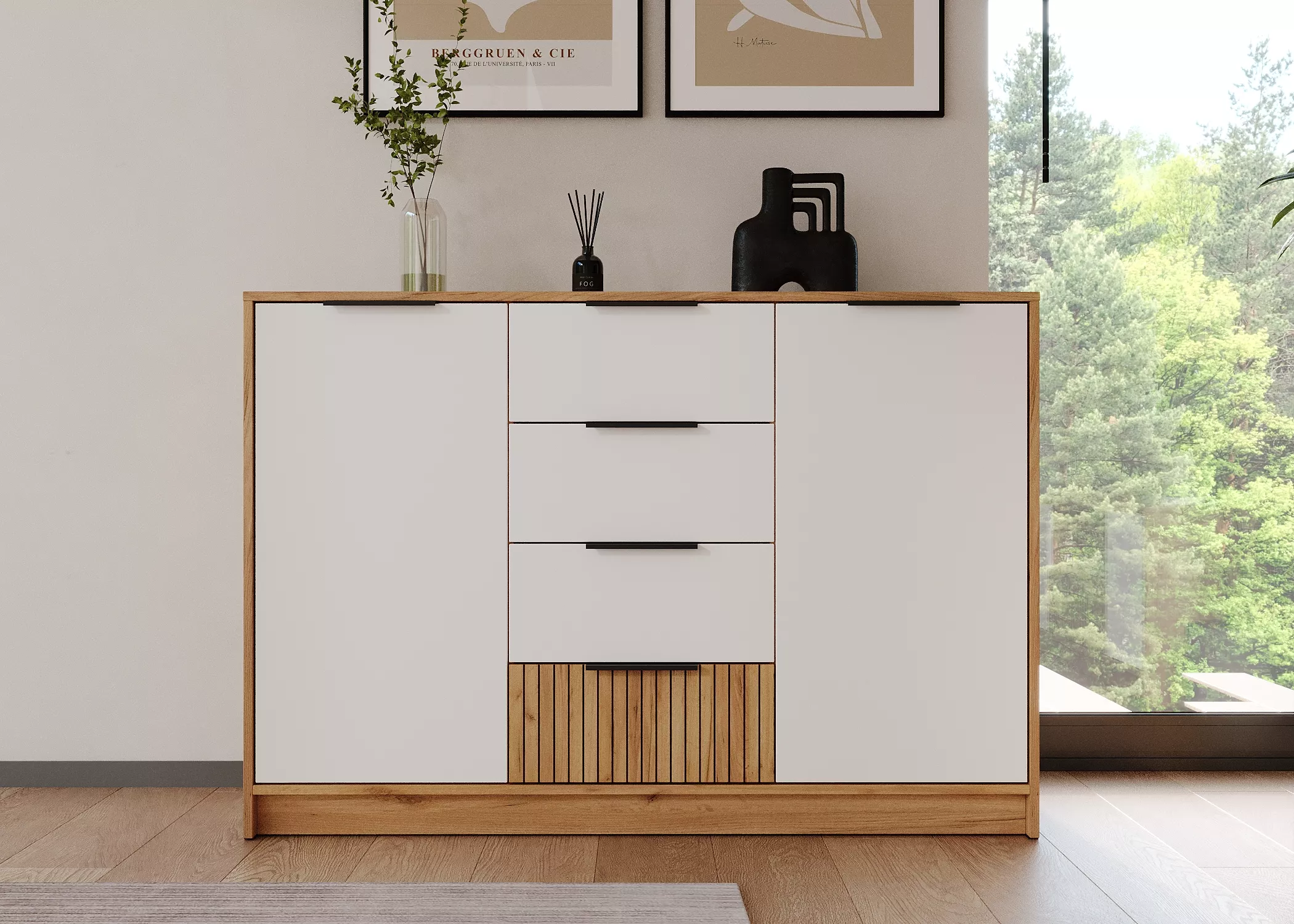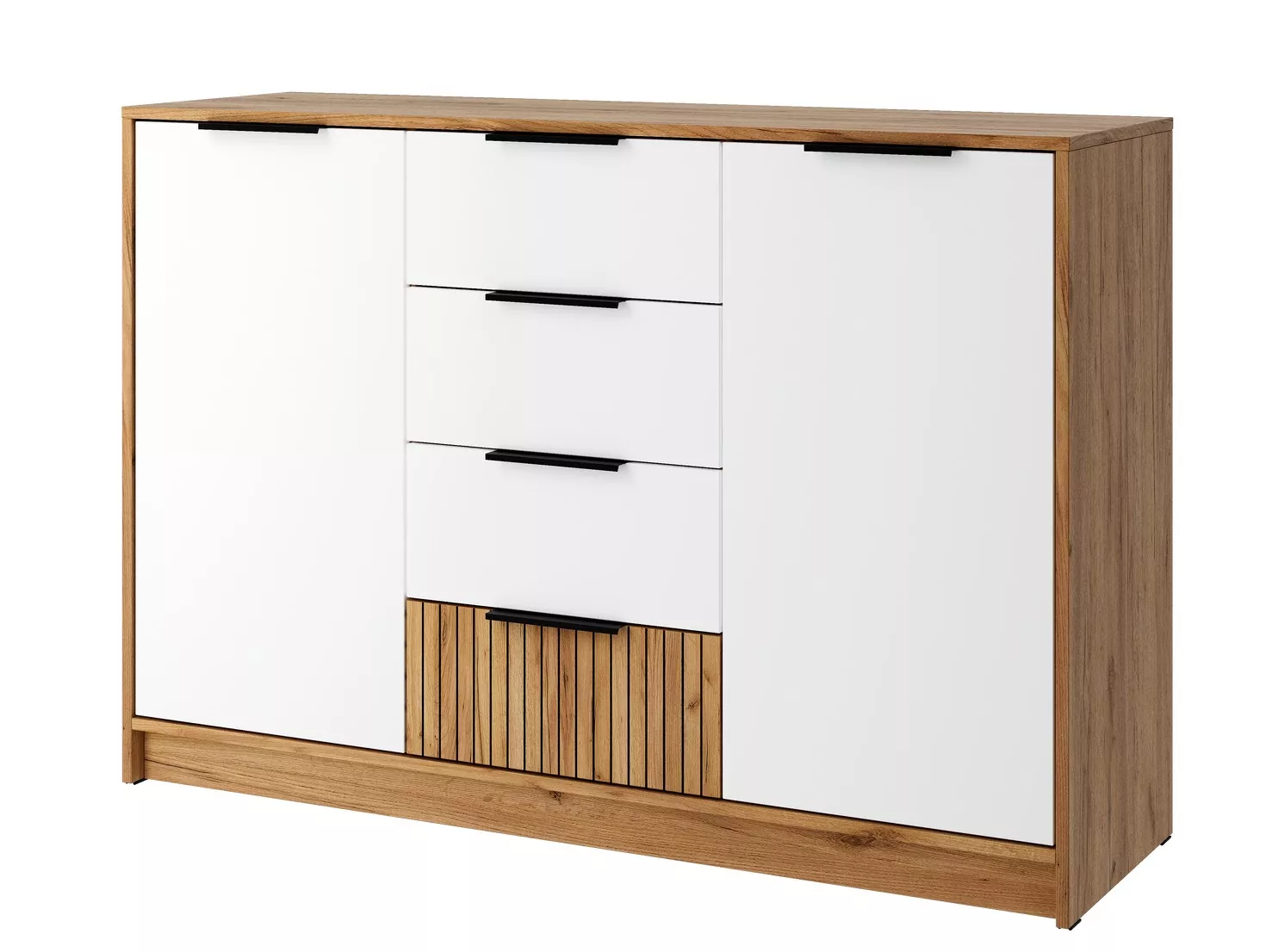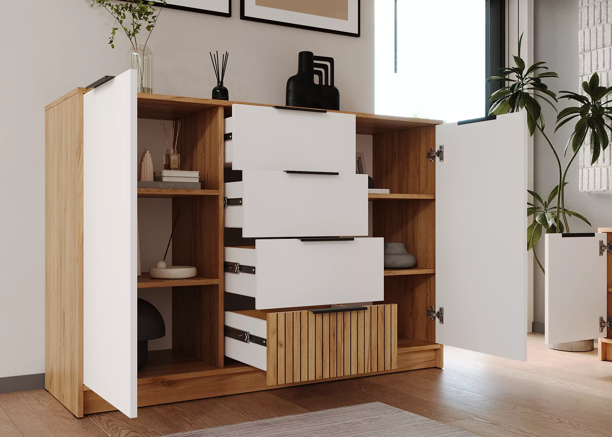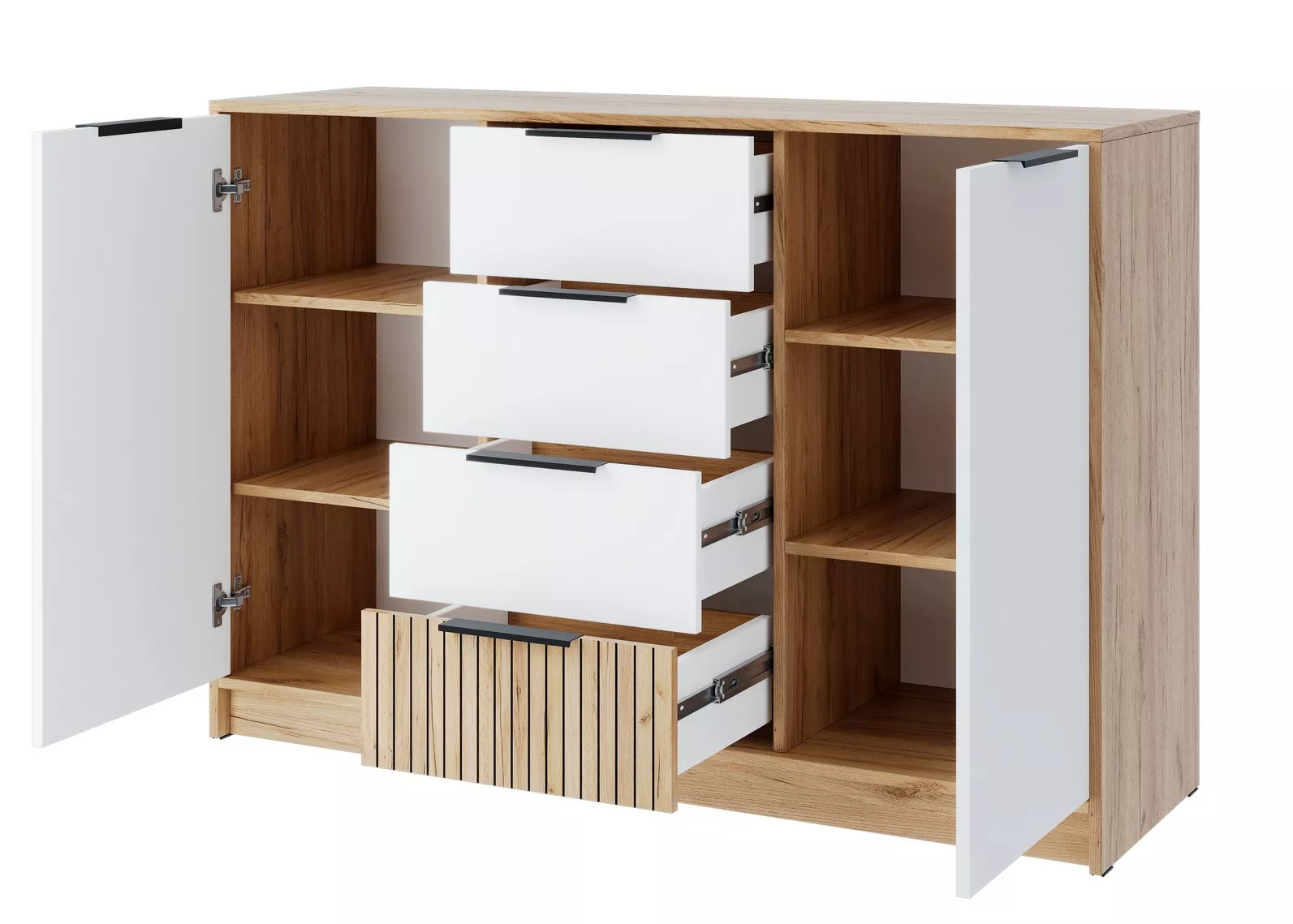 Этот комод сочетает в себе просторные ящики для мелких вещей и удобные открытые полки за створками.