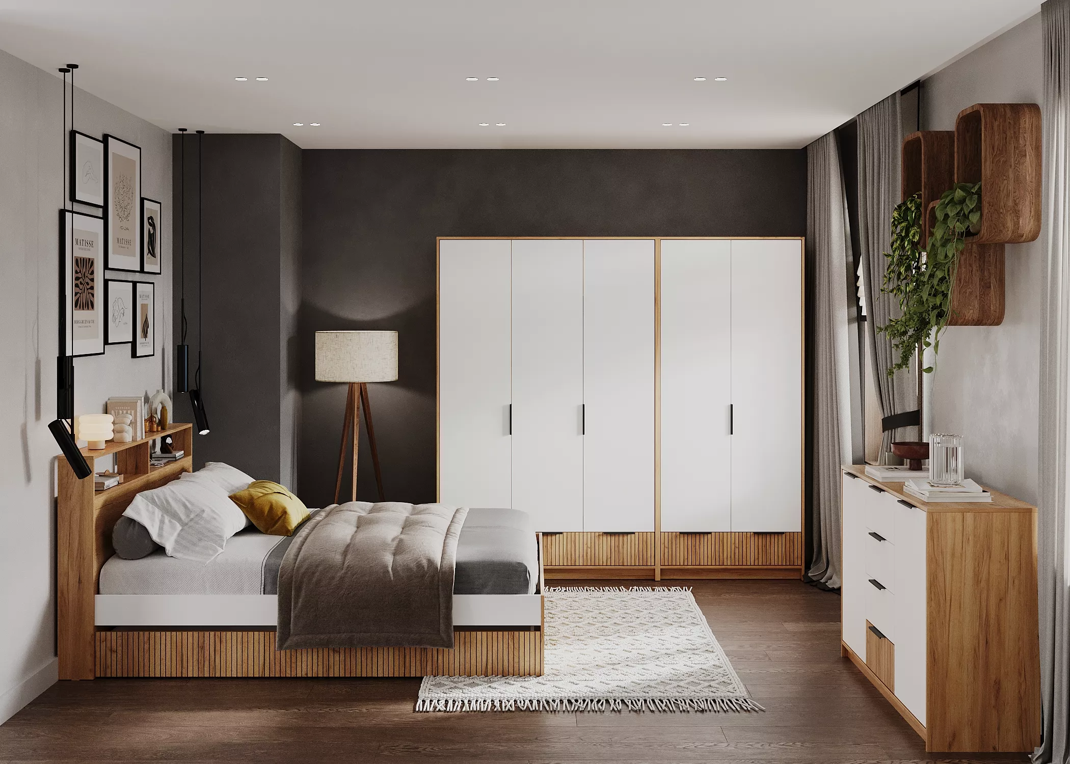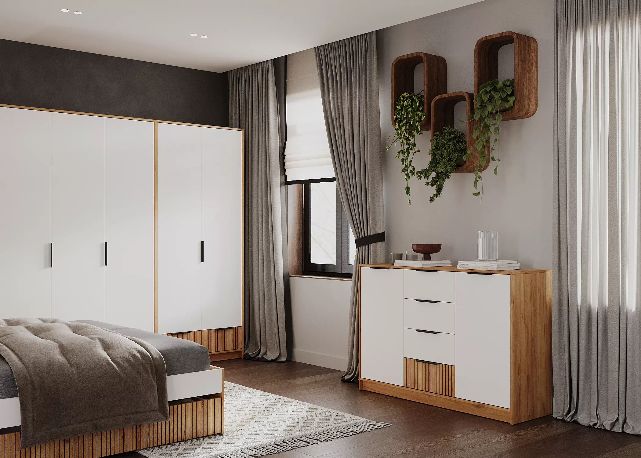 Створки и ящики открываются за черные матовые ручки-профили.