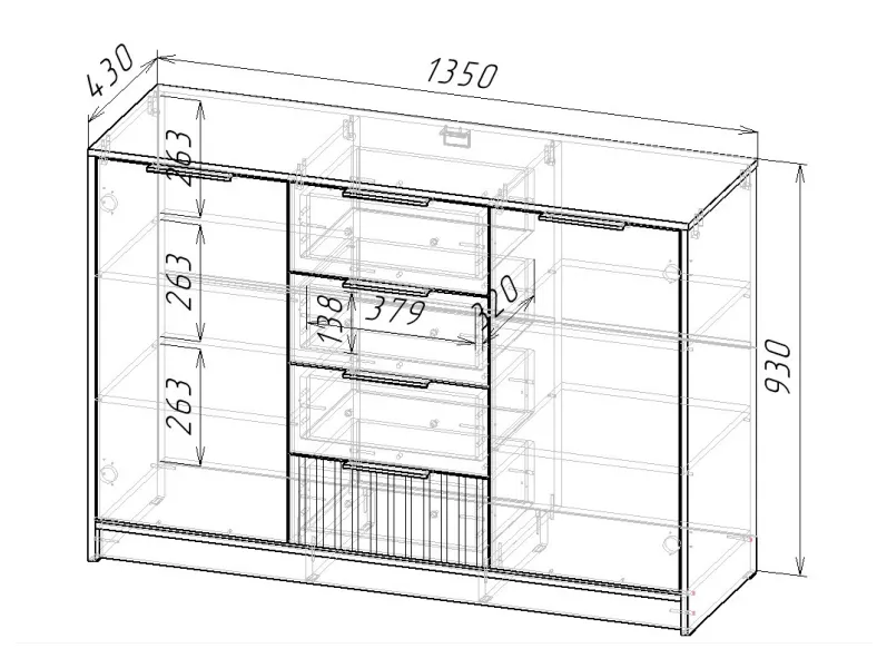 Материалы: корпус и фасады из ЛДСП 16 мм, задняя стенка из белого ЛХДФ.