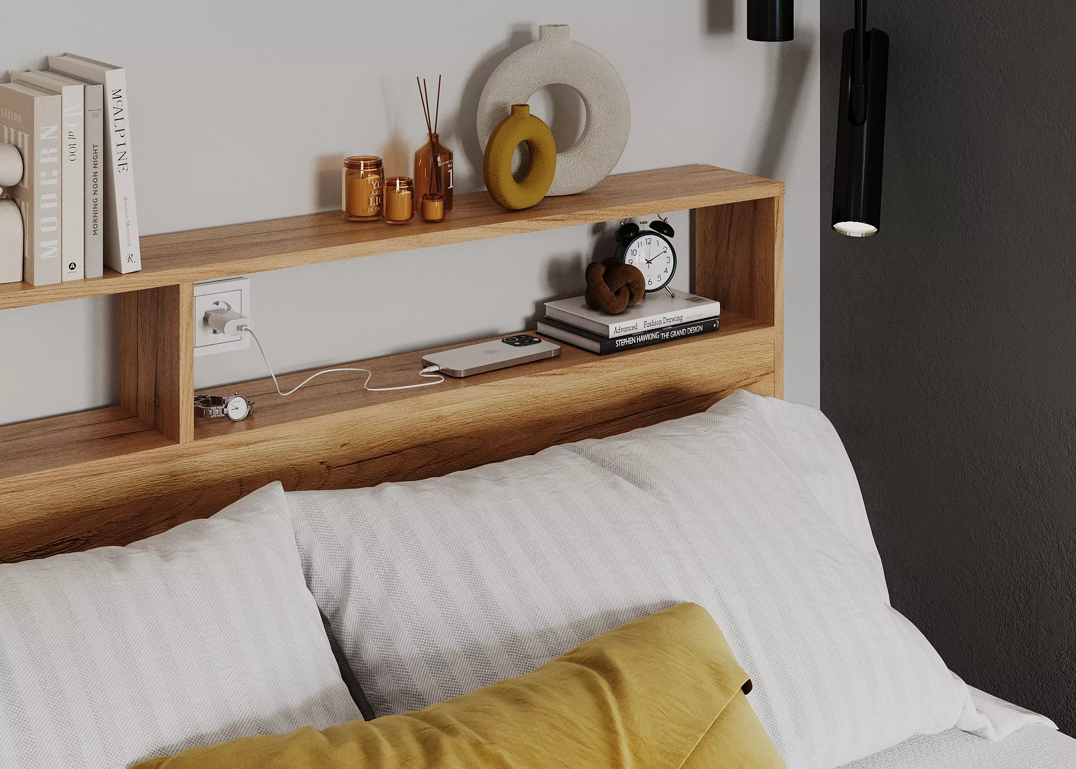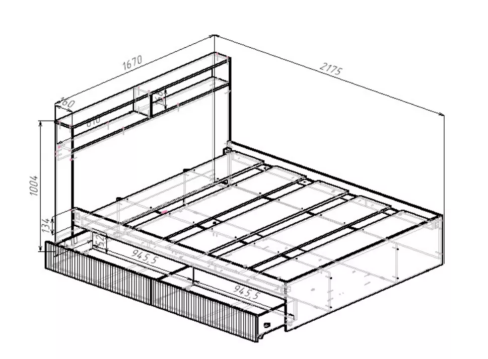 3) К головному щиту кровати прилегает надстройка с полками общим габаритом Ш.1670 х В.1000 х Г.160 мм., представляет собой две крышки, закрепленные по длинной стороне к головному щитку кровати, а по короткой стороне – к двум боковинам, доходящим до уровня пола. Внутреннее пространство между двумя крышками образует нишу для хранения мелкогабаритных вещей, поделенное на две части перегородкой, с полезными габаритами Ш.810 х В.168 х Г.160 мм каждая.