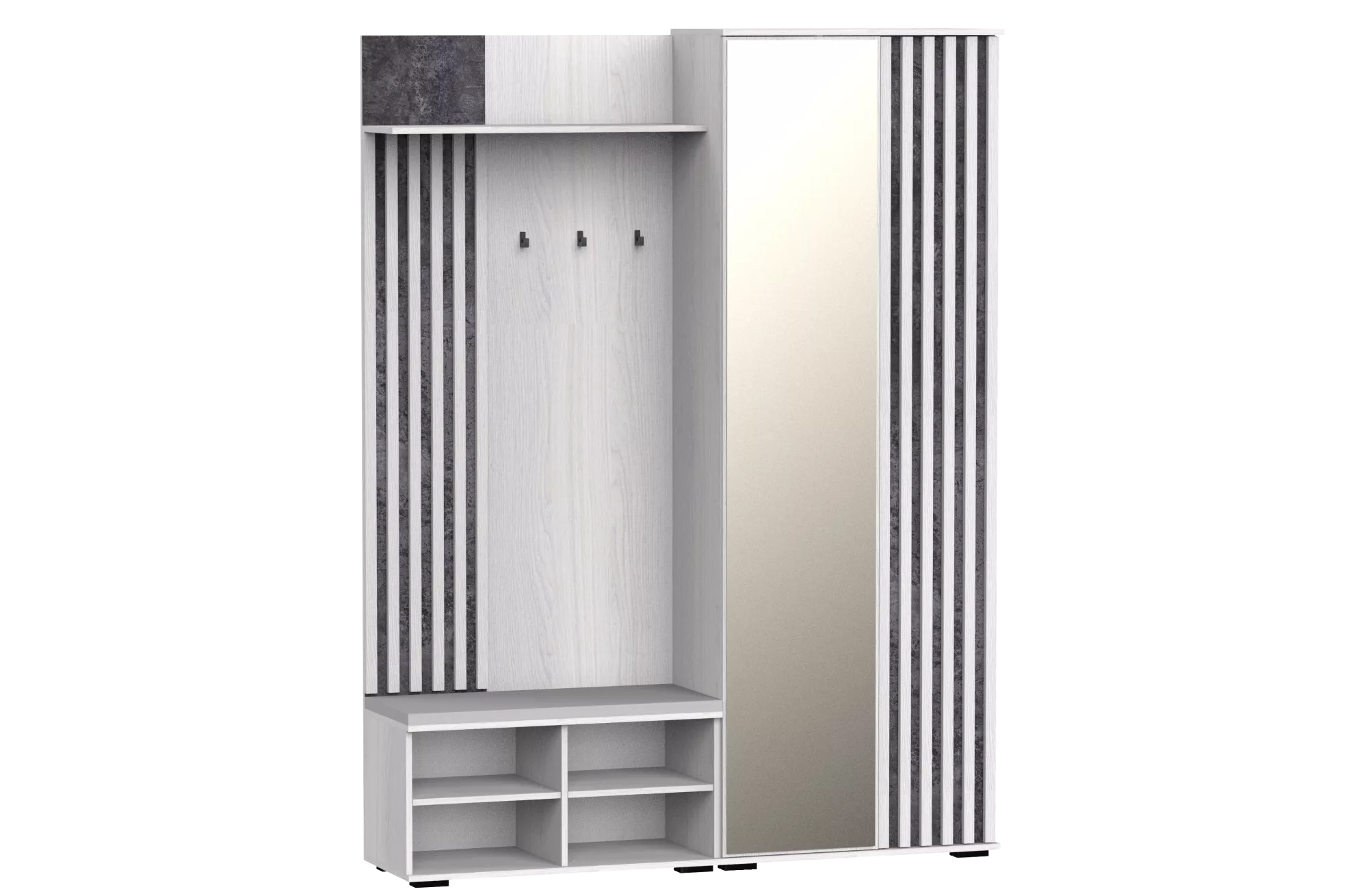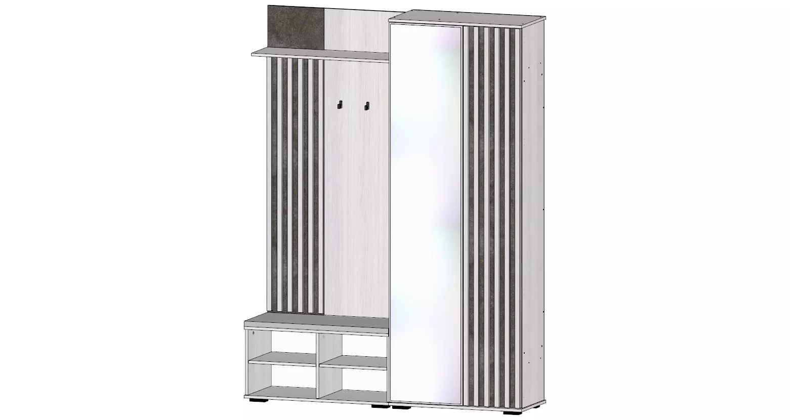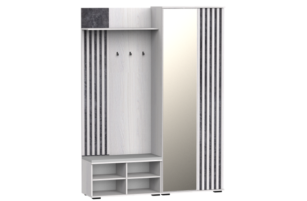 Ключевые элементы: зеркало, место для сидения (пуф), крючки, полки и выдвижная штанга.