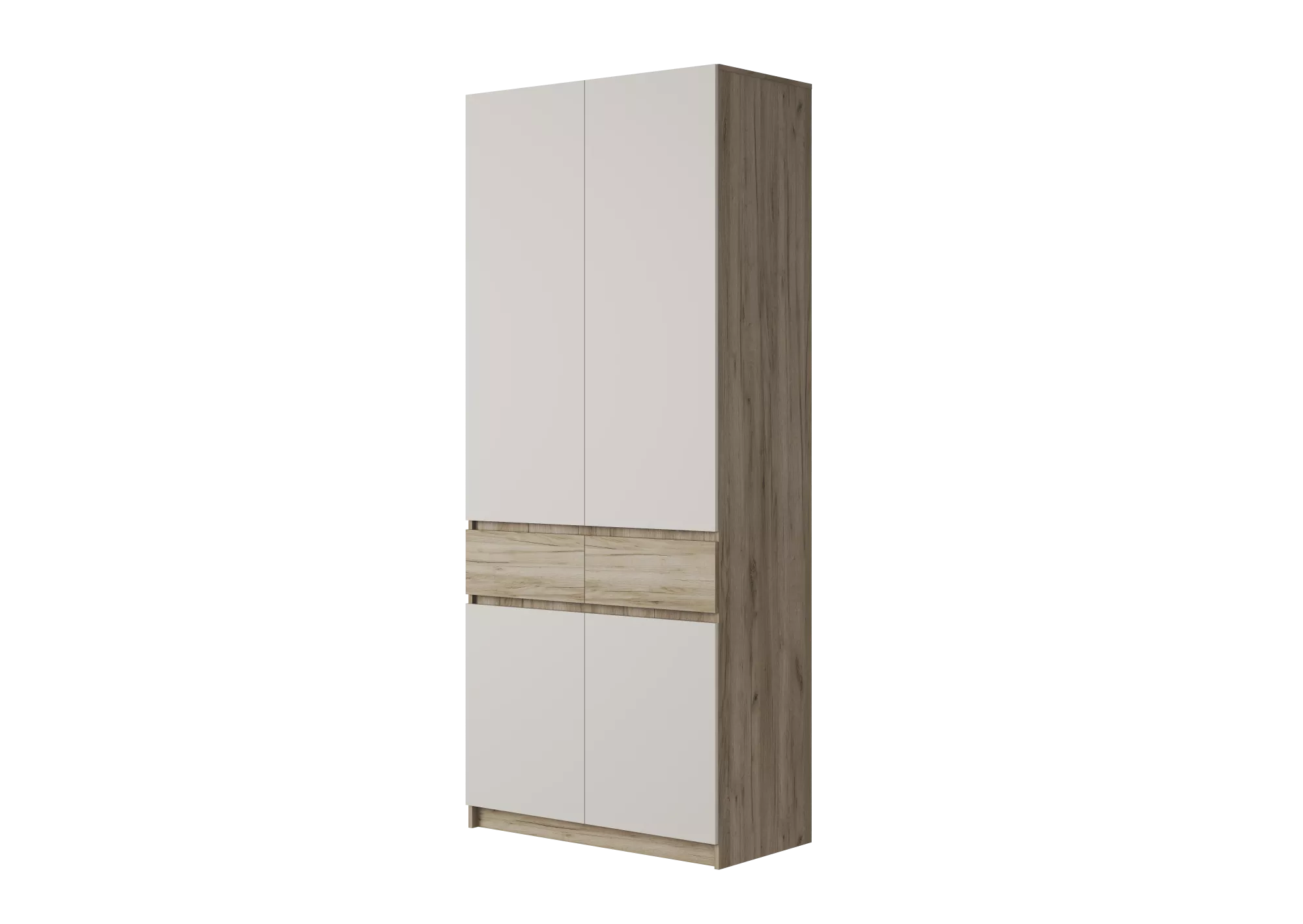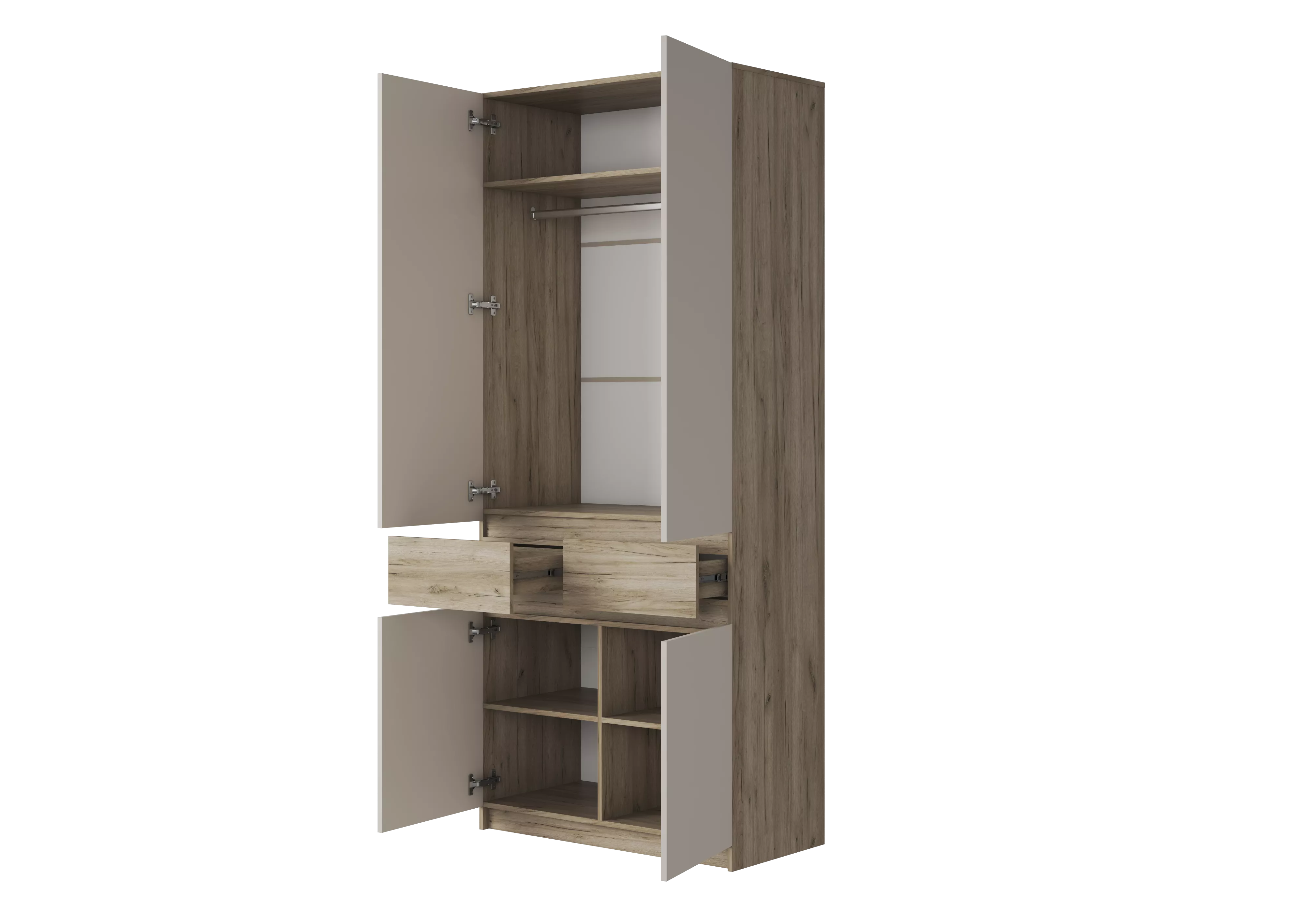 Помимо объемного отсека под одежду с металлической штангой, в шкафе Бостон ШК-001 предусмотрено два удобных выдвижных ящика на шариковых направляющих, а также четыре полки небольшого размера и большая верхняя полка-антресоль.