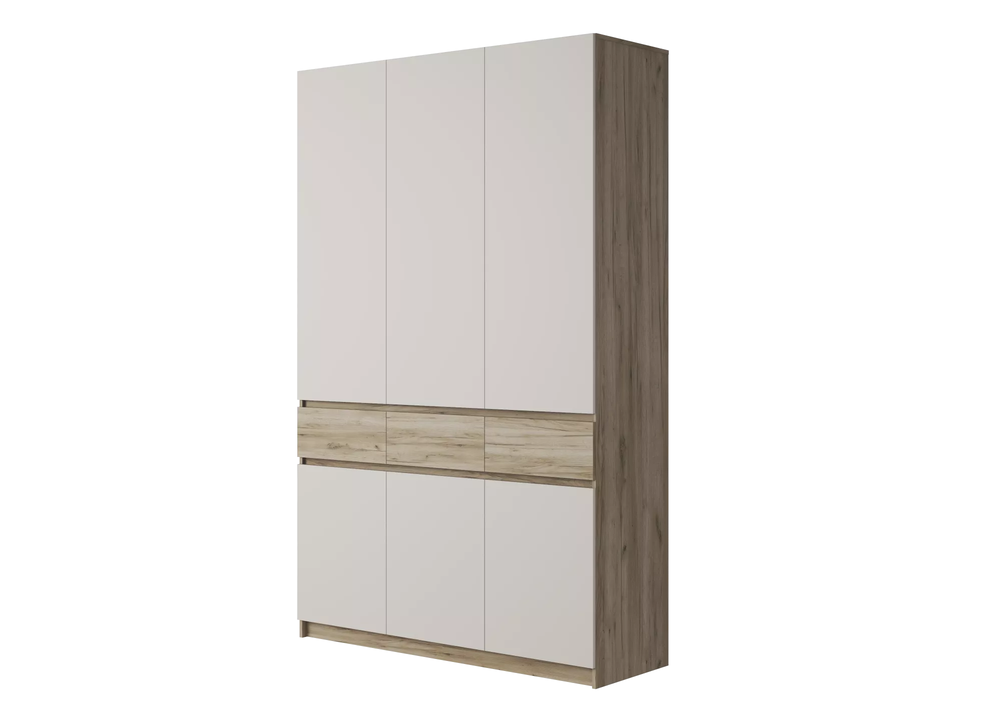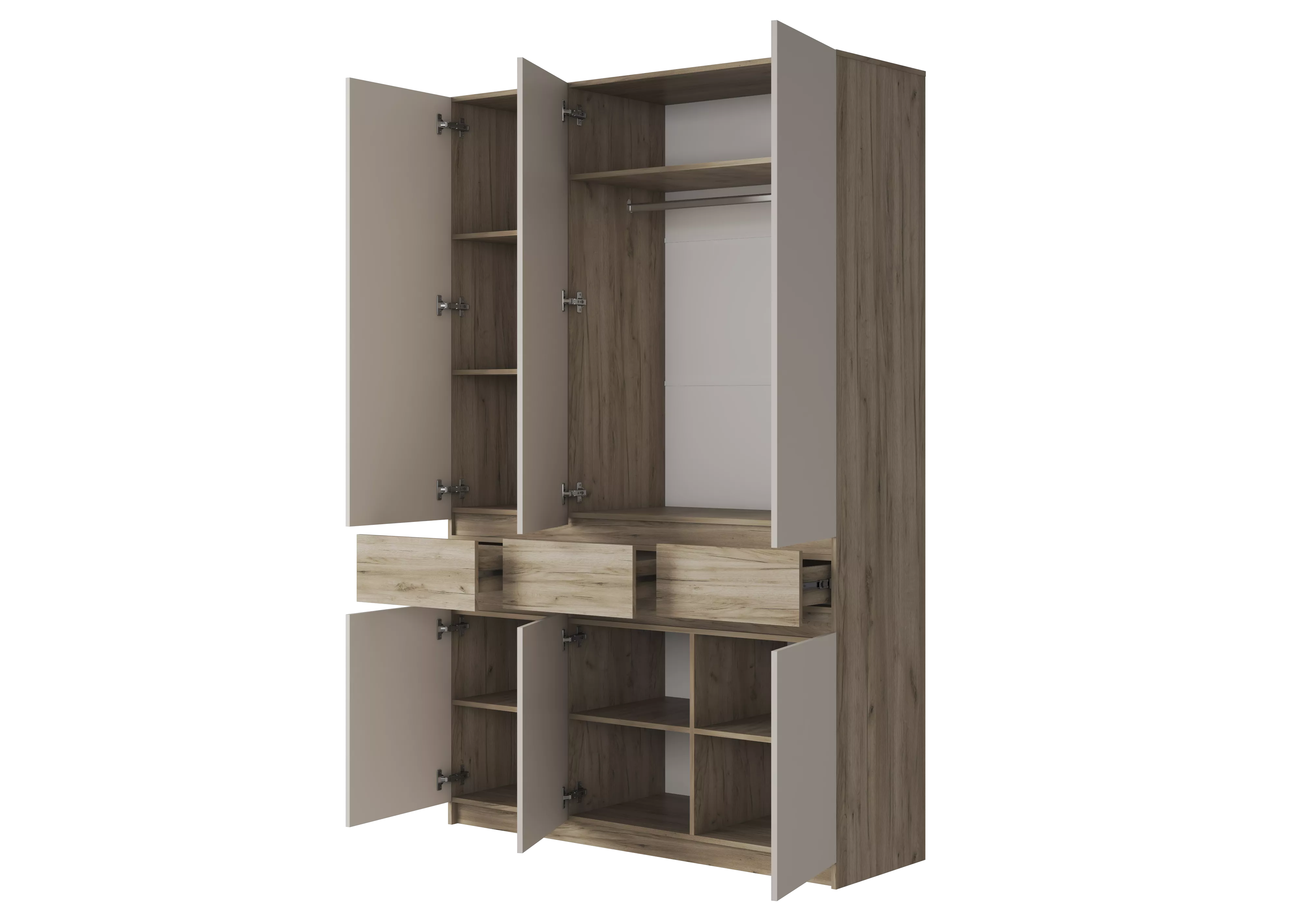 Шкаф предусматривает наличие трех выдвижных ящиков, двух вместительных отсеков для одежды, а также множества полок.