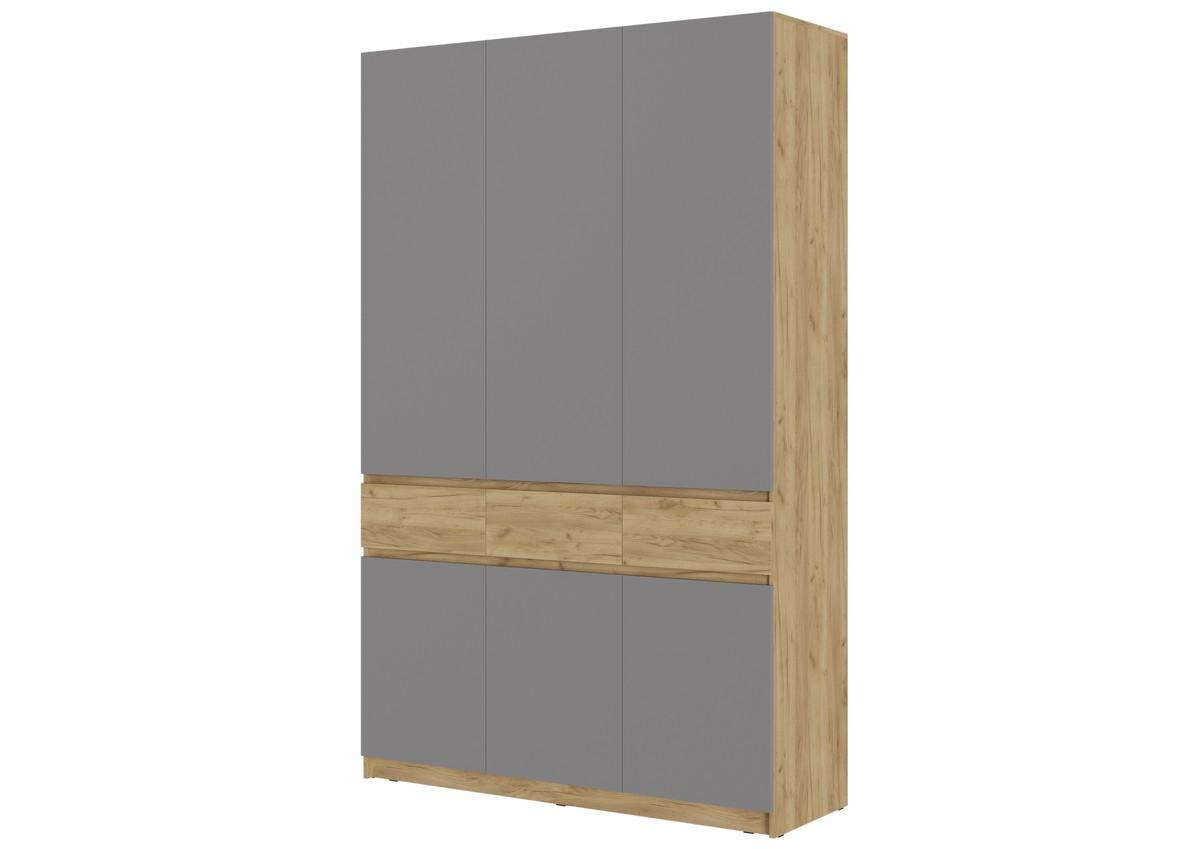 - Шкаф предусматривает наличие трех выдвижных ящиков, двух вместительных отсеков для одежды, а также множества полок.
