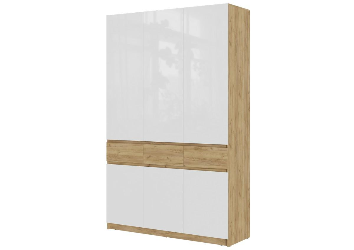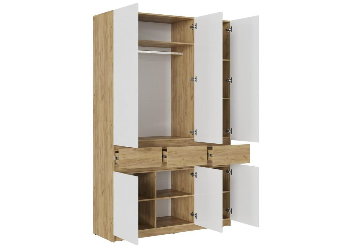 - Шкаф предусматривает наличие трех выдвижных ящиков, двух вместительных отсеков для одежды, а также множества полок.