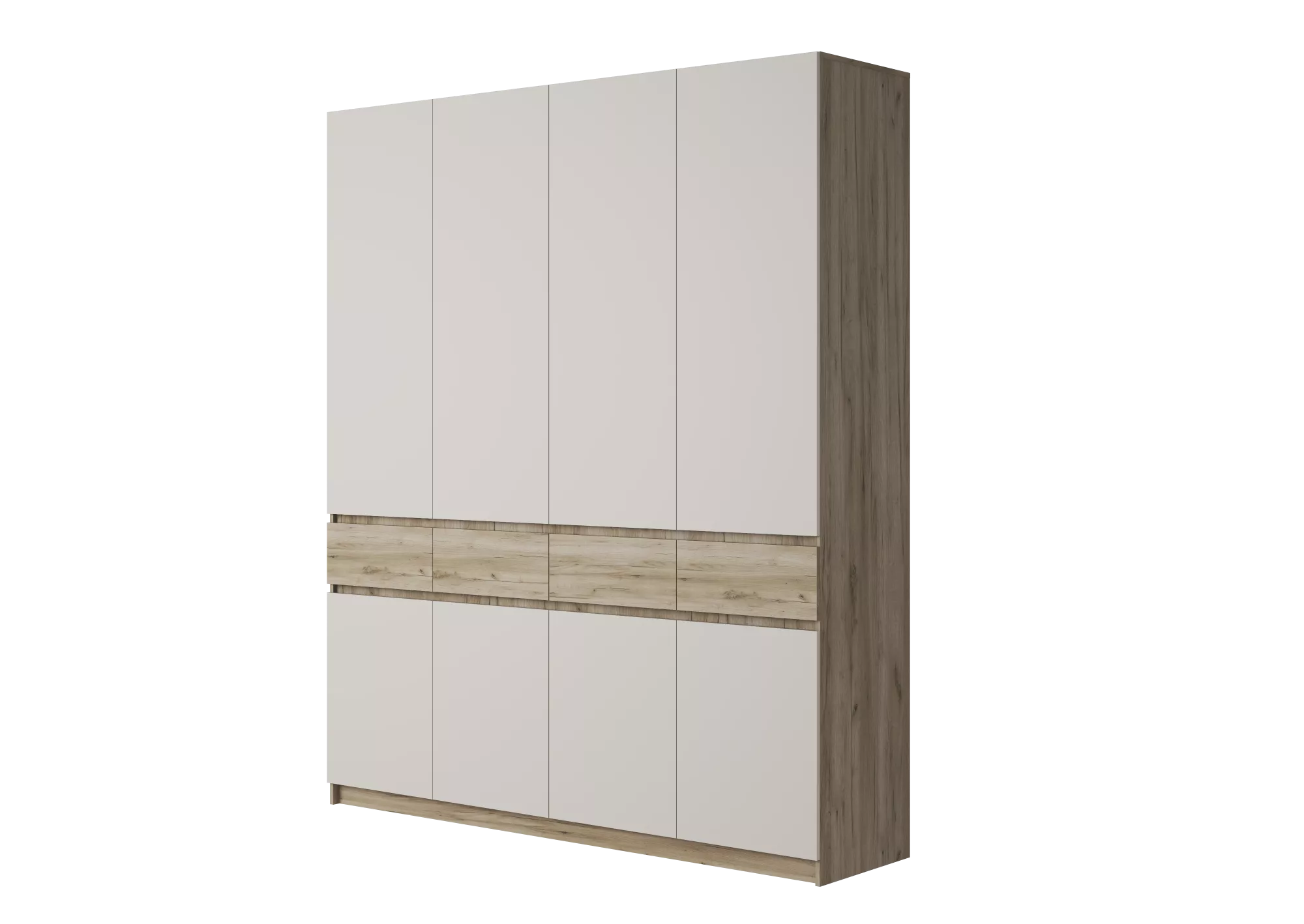 - Шкаф выполнен полностью без ручек, все его элементы открываются за фасад. Для этого предусмотрены специальные зазоры между фасадами, прикрытые декоративными планками.