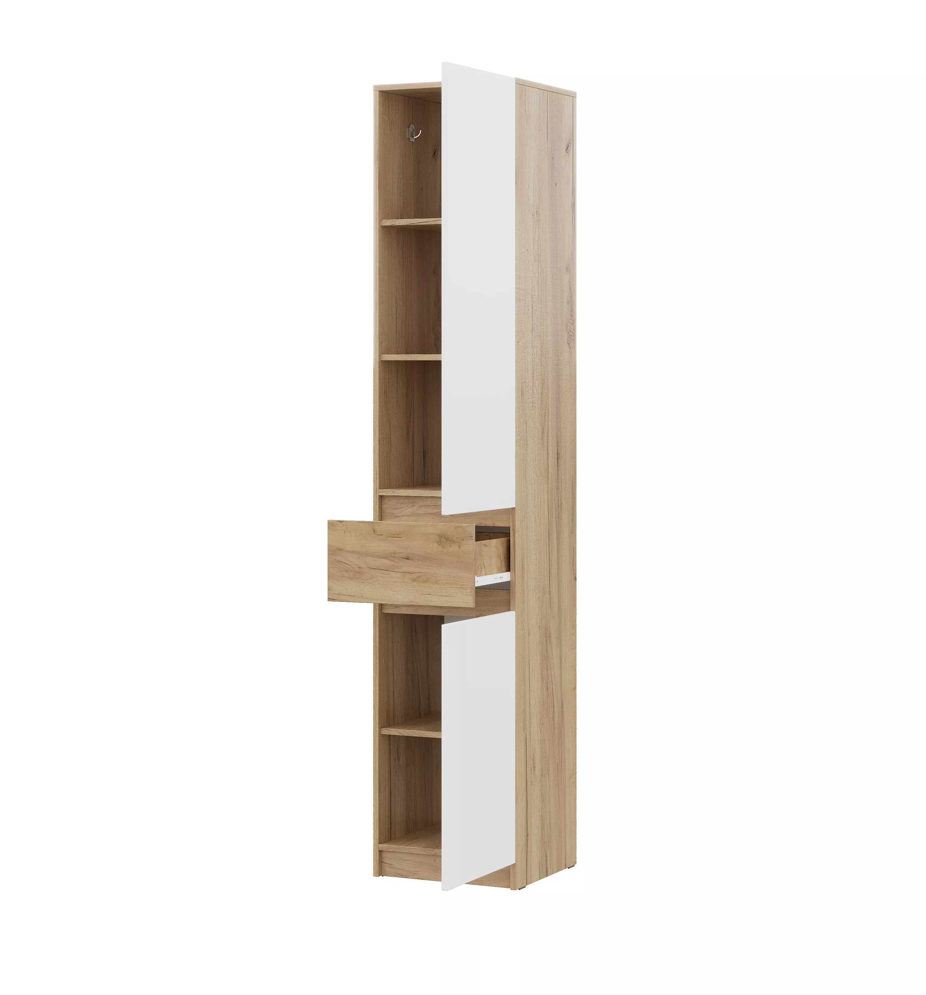 - Верхняя часть: 2 съёмные полки, разделяющие отсек на 3 зоны (368 × 341 × 394 мм) + 2 крючка для одежды.