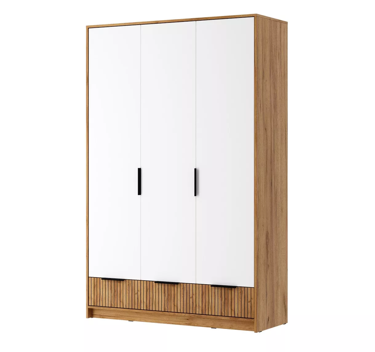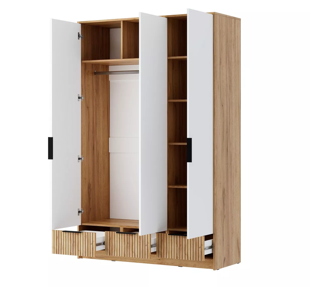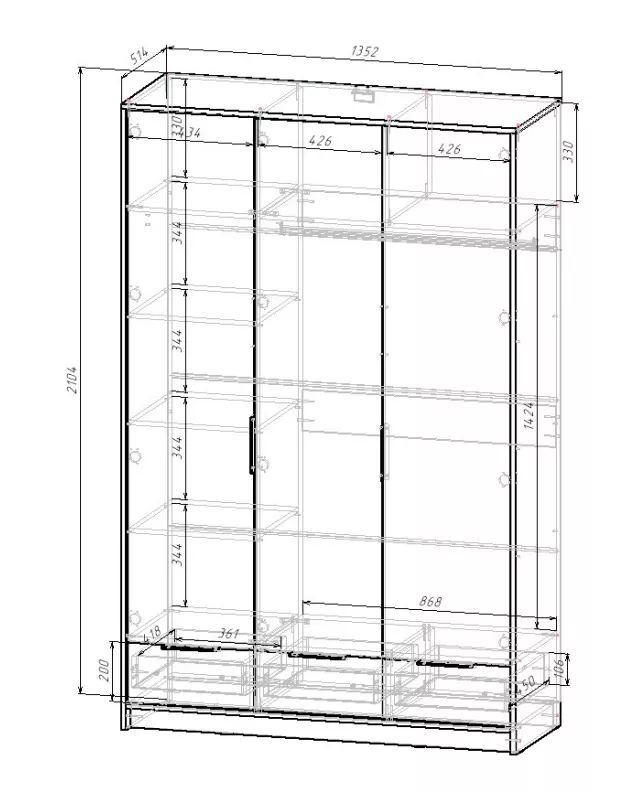 Имеет 3 отделения: центральный - для хранения вещей на полках и вешалках, нижний – с тремя ящиками для мелких вещей или нижнего белья, верхний – антресольный.