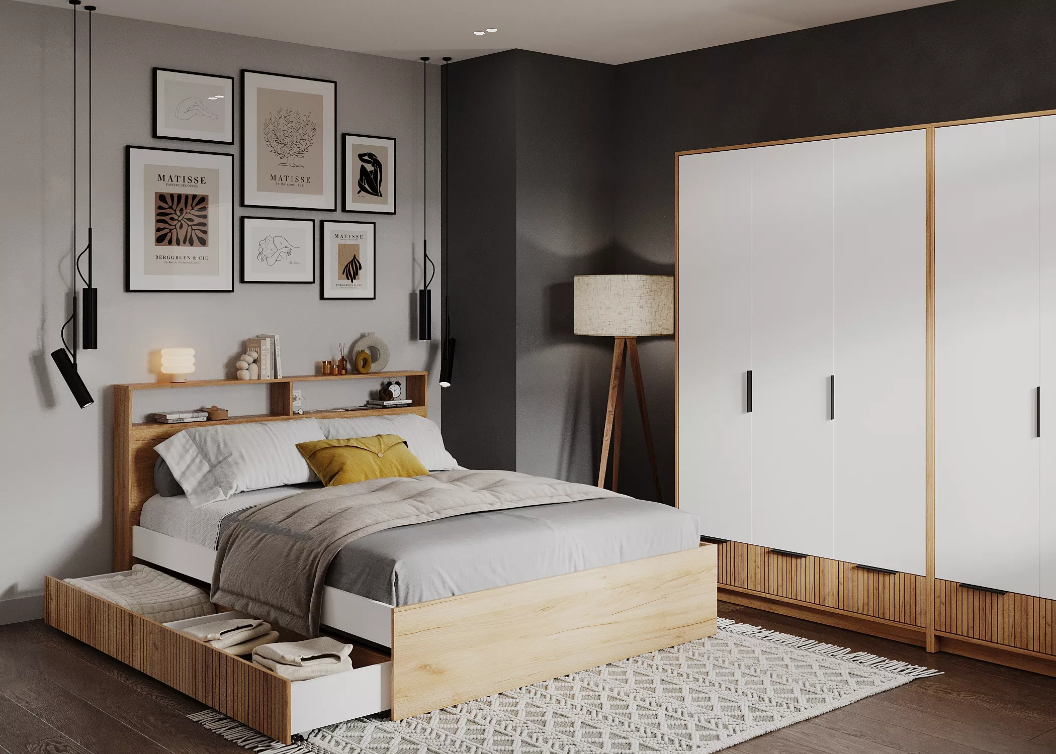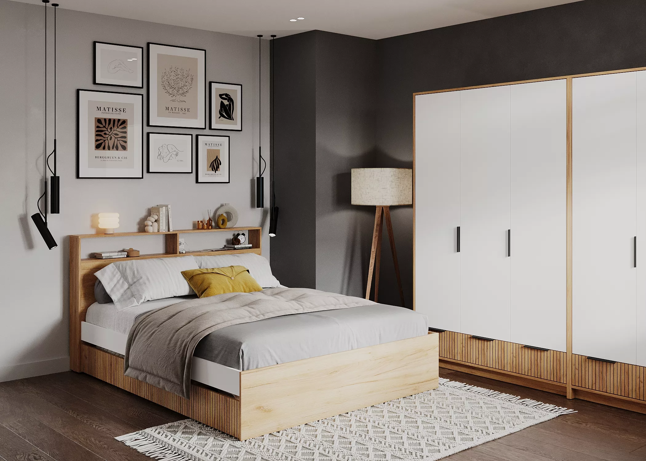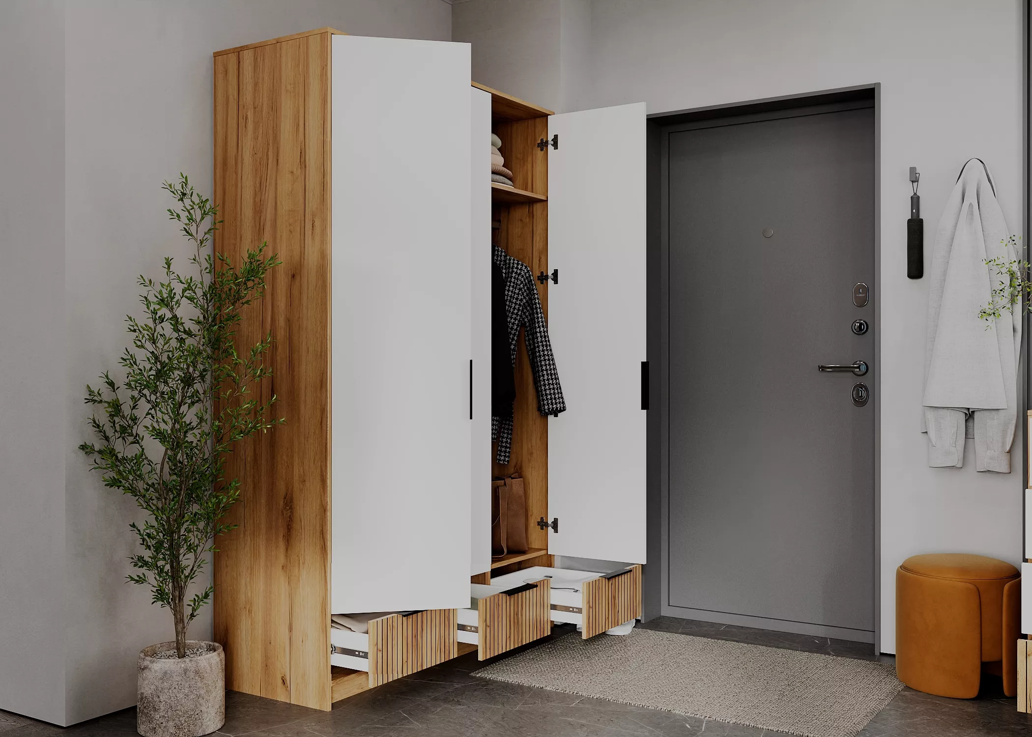 Имеет 3 отделения: центральный - для хранения вещей на полках и вешалках, нижний – с тремя ящиками для мелких вещей или нижнего белья, верхний – антресольный.