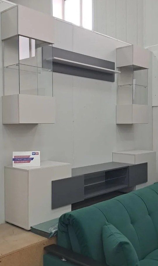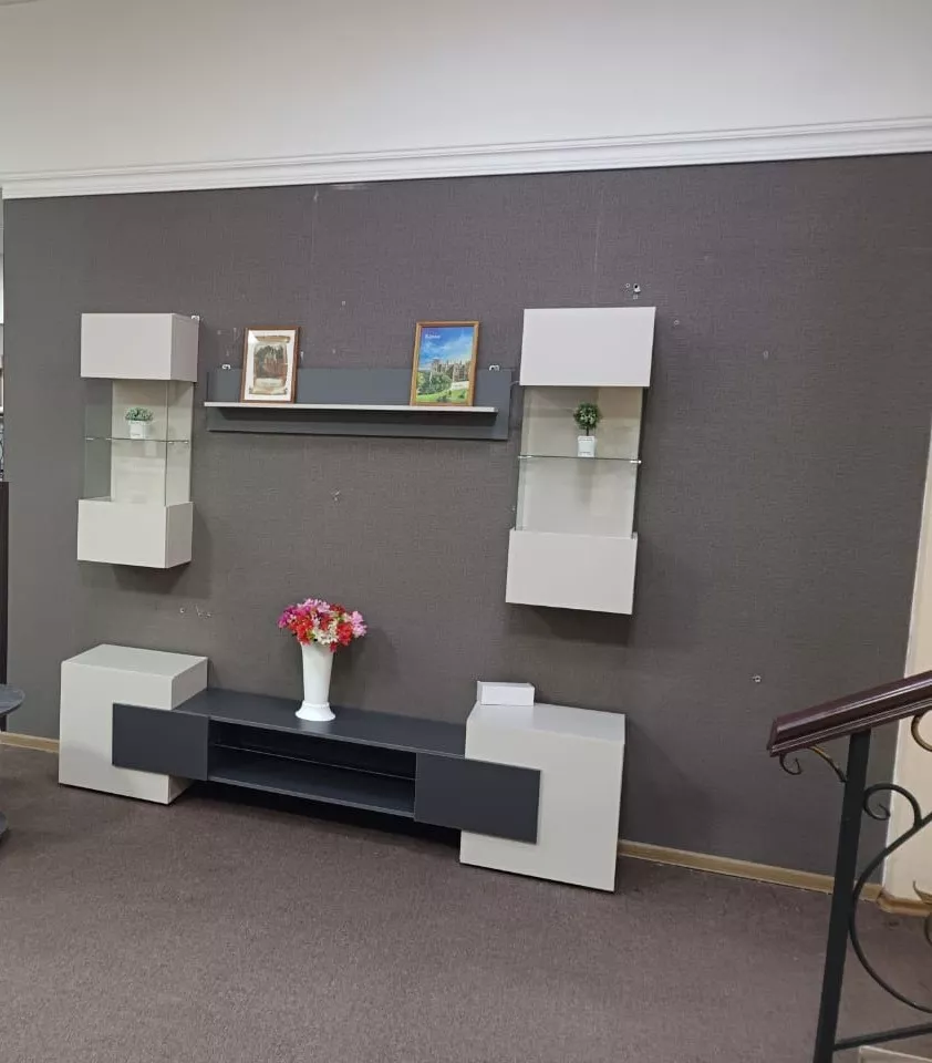 Состоит из четырех модулей: два навесных шкафа, полка и ТВ-тумба.