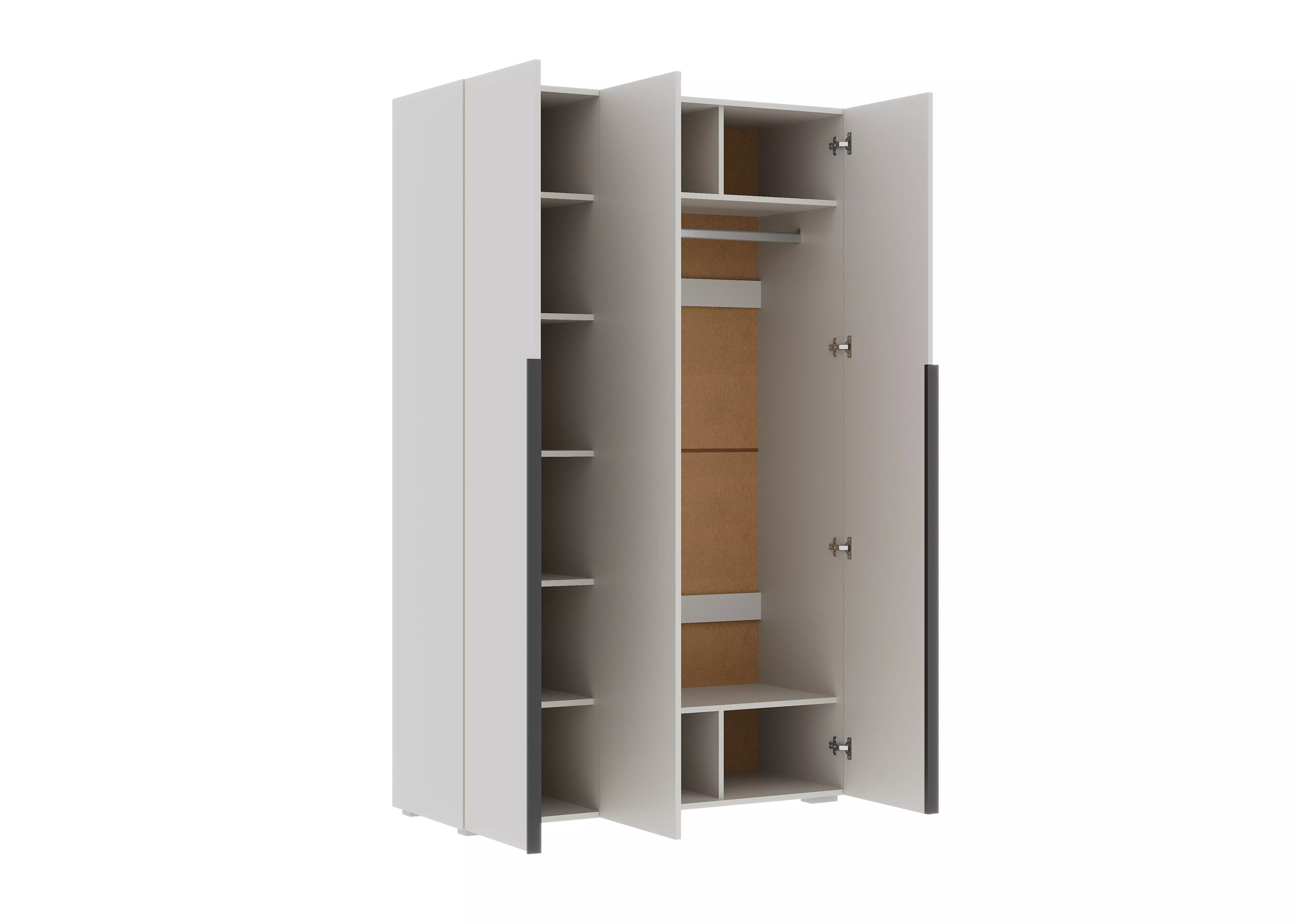 - Секция с регулируемыми полками: шесть полок разной высоты (от 260 мм до 345 мм) позволяют удобно хранить футболки, свитеры, постельное белье или аксессуары. Большинство полок — съемные, что дает возможность настроить пространство гибко.