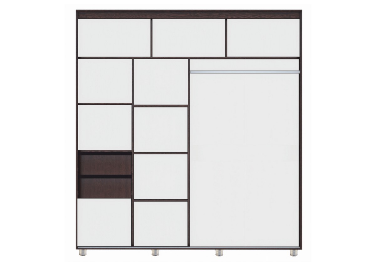• Шкаф имеет отсек со штангой под одежду, отделение с полками для хранения вещей, а также выдвижные ящики.